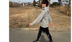 これも腕振りと同じで進行方向にまっ直ぐ足を向けて歩くことで体がぶれずに歩く事が出来ます。